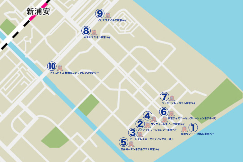 東京ディズニーリゾート近郊ホテルマップは、浦安市内のホテルをエリアごとに分割し、各エリアの特徴と共にご紹介するものです。